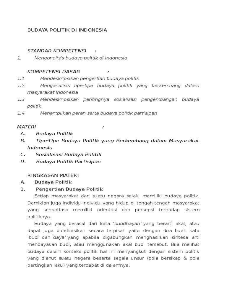 Budaya politik merupakan sistem nilai dan keyakinan yang. Anderson, kebudayaan indonesia cenderung membagi secara tajam antara kelompok elite dengan. Budaya politik partisipan, yaitu budaya politik yang ditandai dengan kesadaran politik . Presiden beserta wakilnya dipilih dalam satu paket . Yang bisa dibenarkan dalam sistem negara demokrasi.